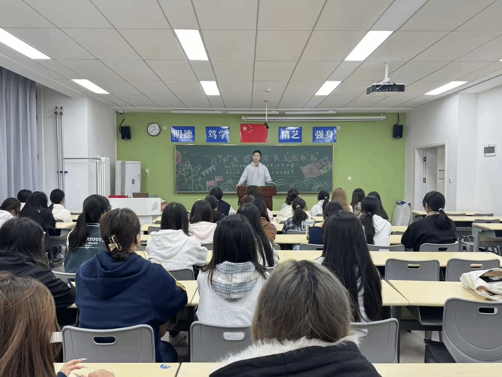 本次主题教育活动以主题班会为主要形式,于周六晚自习时间在全院范围内统一展开。各班级紧密围绕“我和祖国共成长”的主题,策划并实施了内容充实、形式多样的学习活动。班会现场,有的班级组织同学们深情缅怀抗战先烈,回顾那段烽火岁月,感悟革命先辈的崇高精神与坚贞信仰;有的班级开展了生动的抗战历史知识竞答和主题讲述,在互动中加深对历史的理解与认知;有的班级则通过重读抗战家书、分享感人至深的抗战故事,让跨越时空的家国情怀与责任担当浸润学子心田。