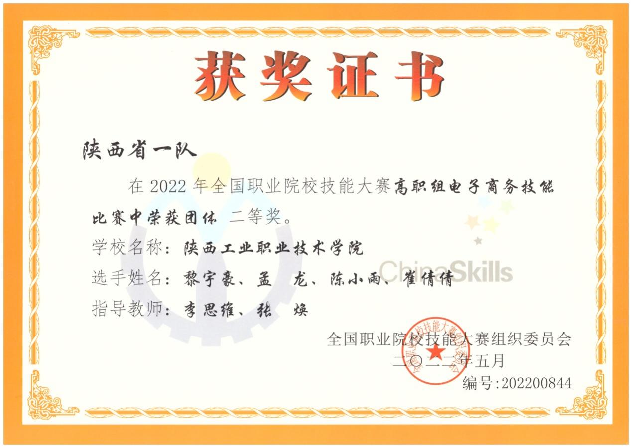 7月30日-31日,2022年全国职业院校技能大赛高职组“电子商务技能”赛项在安徽商贸职业技术学院举行,全国各省、自治区、直辖市以及新疆生产建设兵团的65支代表队参加了本次比赛。我校商贸与流通学院李思维、张焕、杨欣三位教师指导的黎宇豪、孟龙、崔倩倩和陈小雨四位同学组成的代表队代表陕西省参赛。经过两天的激烈角逐,最终荣获国赛团体二等奖。