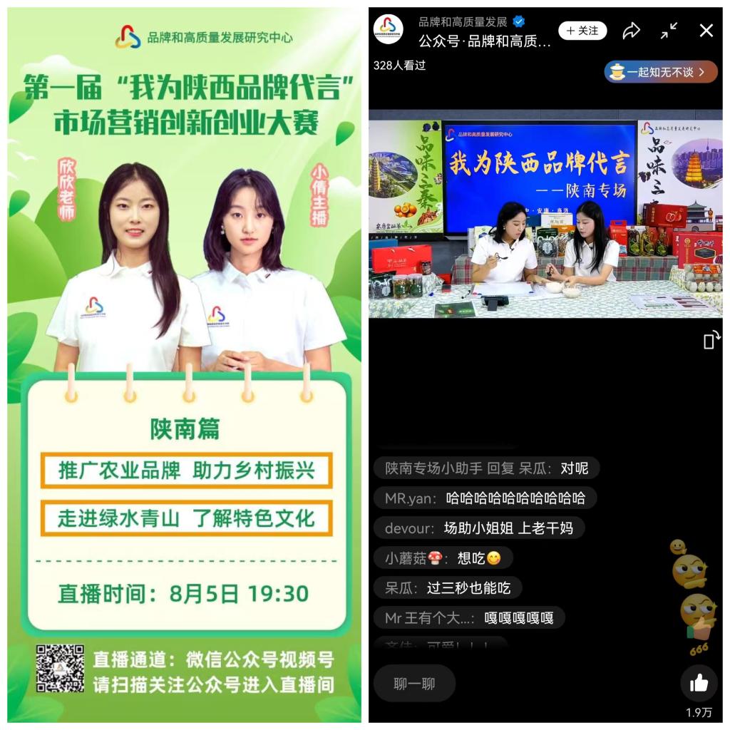 8月2日至5日,我校商贸与流通学院教师杨欣、学生蔡思竹受邀参加“我为陕西品牌代言”暑期系列直播第六场——陕南专场活动。本次直播活动由陕西省品牌和高质量发展研究中心举办。
