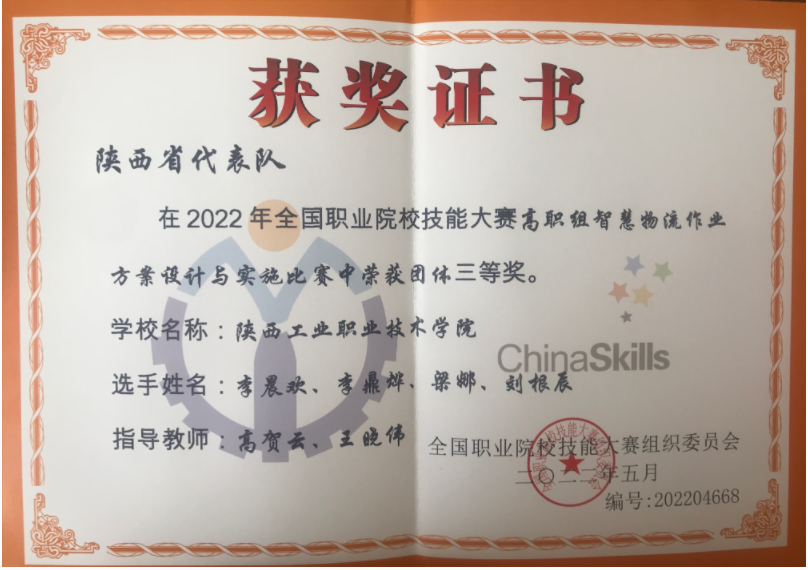 8月22日-24日,2022年全国职业院校技能大赛高职组(中诺思杯)智慧物流作业方案设计与实施赛项在天津交通职业学院举办。我校商贸与流通学院由高贺云、王晓伟老师指导,现代物流管理专业李晨欢、李鼎烨、梁娜、刘根辰4名同学组成的代表队斩获团体三等奖。