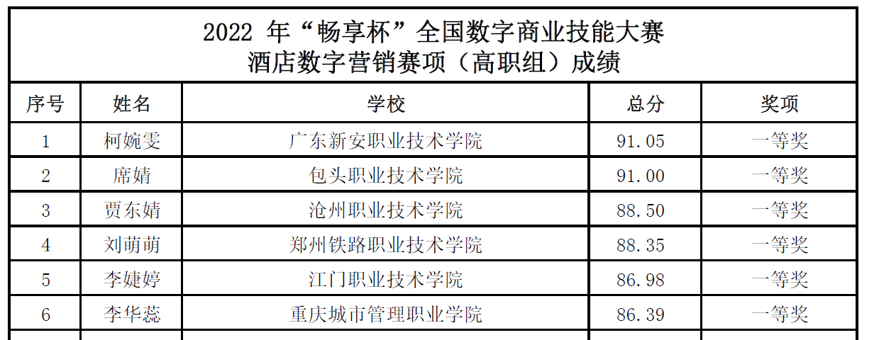 12月28日,由中国商业联合会主办,中国商业联合会互联网应用工作委员会承办的2022年“畅享杯”全国数字商业技能大赛酒店数字营销赛项落下帷幕,由我院孙菲指导的商数2101班王卓妍同学、刘瑞老师指导的商数2101班闫璐同学最终荣获大赛二等奖。
