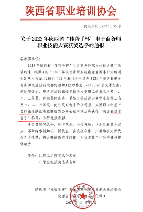 11月18日,2023年陕西省电子商务师职业技能大赛决赛顺利举行。大赛由陕西省人力资源与社会保障厅主办,陕西蓝天民航技师学院承办,我院派出8名师生参赛,获得职工组前3名1项,二等奖3项,三等奖1项,优秀奖1项;学生组获前3名1项,一等奖1项,获奖级别和数量名列前茅。