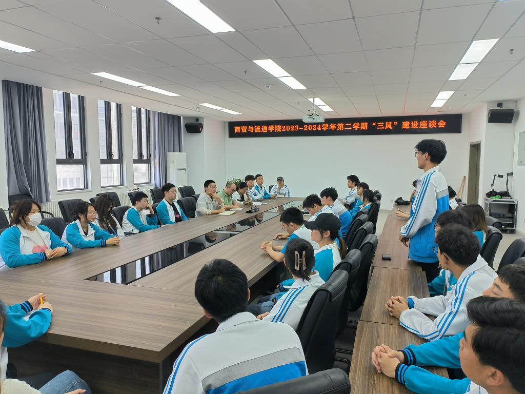 根据学校《关于开展2023—2024学年第二学期学生教育管理期中检查工作的安排》安排,为倾听学生在“三风”建设中的需求与反馈。5月14日下午,商贸学院在崇理楼E604会议室召开2023-2024学年第二学期“三风”建设座谈会,商贸学院党总支副书记蒋鹏出席,辅导员、班主任、在校学生学生代表共50人参加了此次座谈会。座谈会由商贸学院学生第一党支部书记万永亮主持。
