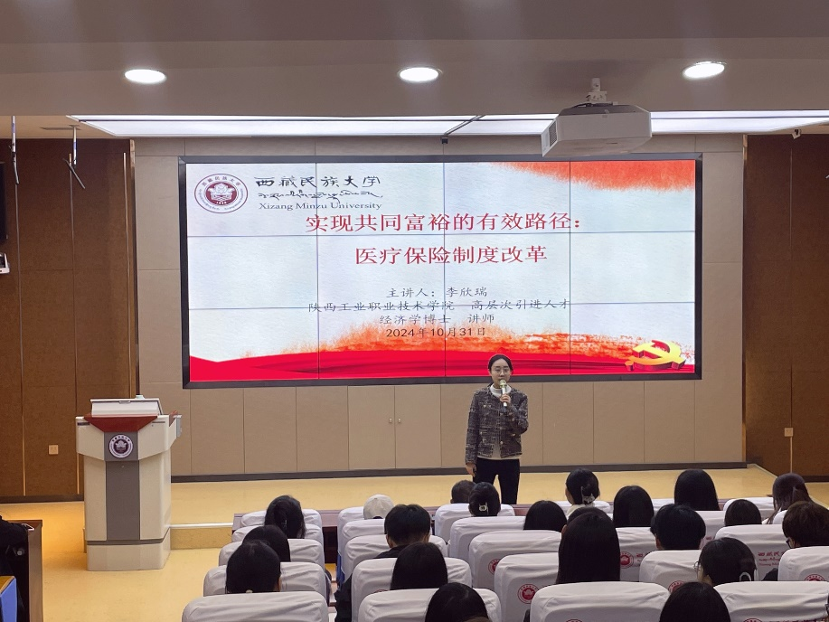 2024年10月31日晚,商贸与流通学院教师李欣瑞博士受西藏民族大学财经学院邀请,为该院研究生做了题为《实现共同富裕的有效路径:医疗保险制度改革》的学术讲座。西藏民族大学财经学院院长陈爱东教授、财经学院100余名研究生出席该讲座。