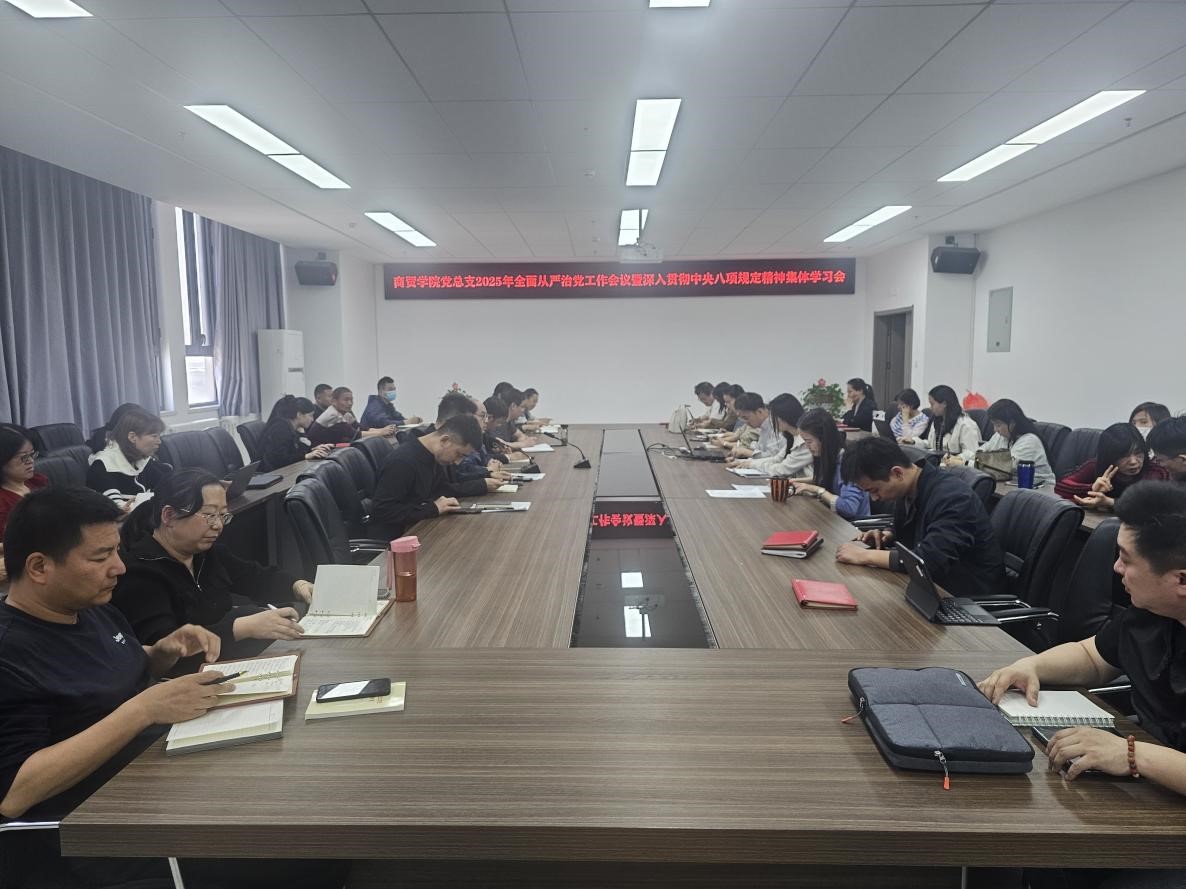 为压实全面从严治党责任,营造风清气正的政治生态和育人环境,把深入贯彻中央八项规定精神学习教育成果转化为干事创业的务实行动和实际成效,4月14日,商贸与流通学院党总支在崇理楼B604会议室召开学院2025年全面从严治党工作会议暨深入贯彻中央八项规定精神集体学习会。商贸与流通学院党总支副书记蒋鹏主持,全体教职工参加。