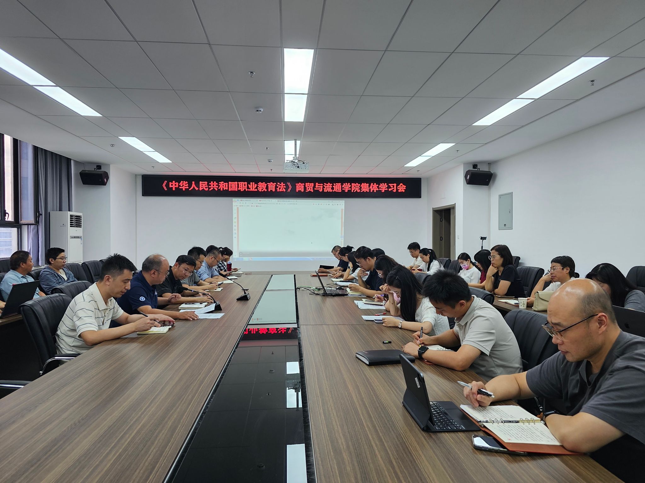 为深入贯彻落实国家职业教育发展战略,准确把握新修订的《中华人民共和国职业教育法》核心要义,切实将法律精神融入学院教育教学与专业建设全过程。9月15日,商贸学院在B604会议室召开《职教法》专题集体学习会。学院领导班子成员、各教研室主任及全体教职工参加本次学习,会议由商贸学院党总支副书记、副院长张光主持。