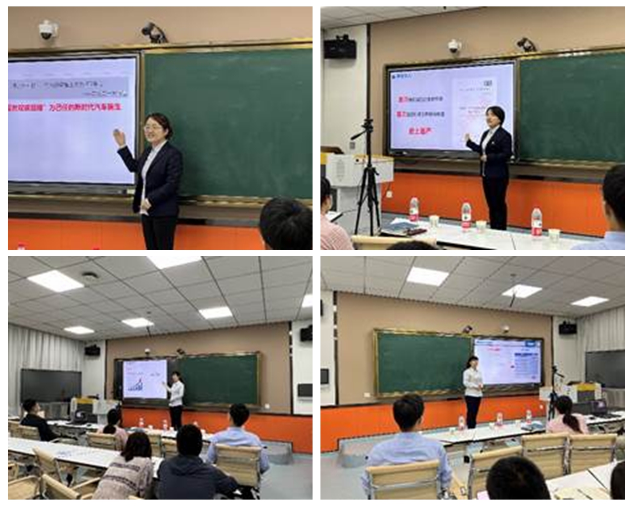 首先,许冀阳介绍了参与本次观摩活动的领导和老师以及活动的主要流程。随后,由吴晨、韩丹团队与孙延、孟妮团队的四名教师分别依托《汽车电子控制技术》和《新能源汽车顾问式销售》两门课程,分别进行10分钟说课和15分钟课堂教学展示。两组团队深入挖掘课程中蕴含的思政内涵,从教学目标、学情分析、教法学法、教学流程和教学反思等方面进行了教学展示。在教学展示过程中,教师精神饱满,语言流畅,能灵活、艺术的将思政教育目标融入教学过程,展现了良好的专业水平和职业素养。