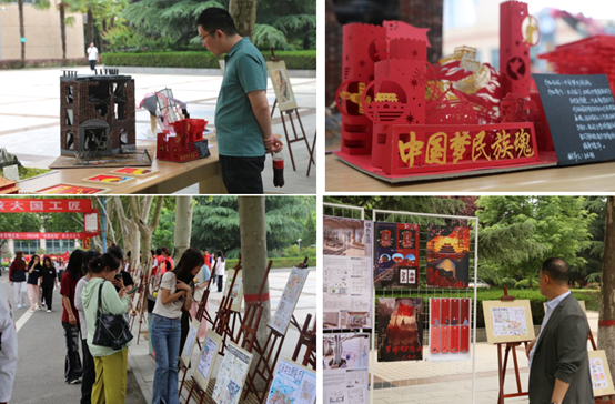 本次展览总共展出八十余件学生优秀作品,主要来自学生的课程设计、协会设计活动以及学生技能大赛,一共涵盖空间设计、文创产品、模型设计、虚拟漫游等模块,空间设计板块围绕红色文化、养老服务、乡村振兴等方向进行创新创意设计,包括住宅、阅读空间、老年文化中心,城市公共空间设计等,主题源自生活、贴近时代,探索了多样的设计理念及技术,用创新点亮红色记忆,用设计传承红色精神;文创产品板块结合了专业特点,以红色文化为主题,设计作品包含书签、台历、团扇、记事簿等,集文化、创意、美感于一体,展现家国情怀;模型设计板块以红色建筑为主题,展现材料、艺术和设计三者结合的革新创造,其中作品《战火中的城市》以淞沪战役为背景,以我过军队誓死保卫的上海四行仓库为原型,通过场景制作,提醒人们勿忘国耻,牢记历史;特别是利用3D数字技术制作了我校校史馆全景漫游,给学校发展关键节点建立了永久数字记忆。