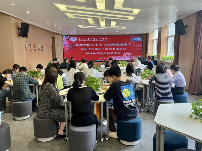 在第38个教师节即将来临之际,为持续增强教师责任感、加强师德师风建设,9月8日下午,马克思主义学院以“喜迎党的二十大,培根铸魂育新人”为主题,在VR智慧思政实训中心召开了教师节座谈会暨师德师风专题教育会。会议采用线上线下相结合的方式进行。马院副院长王辉主持会议,副院长王艳、办公室主任陈晨、实训中心主任陈杜昊以及学院全体教师参加了本次会议。