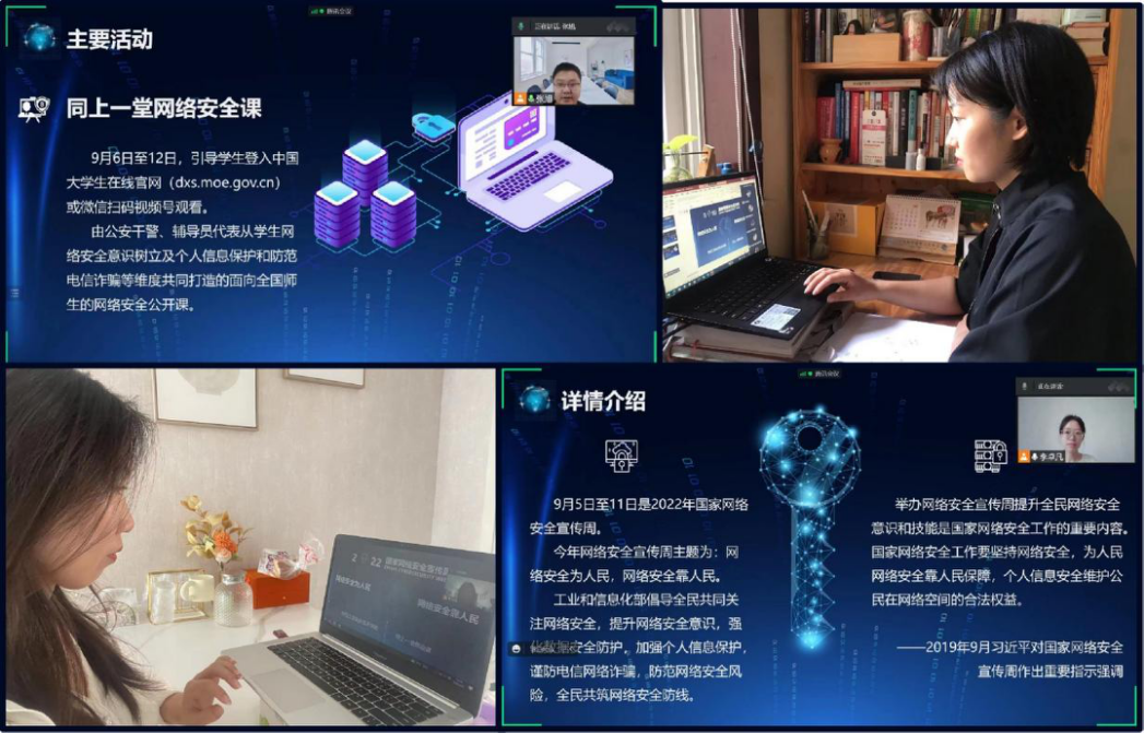 为深入学习贯彻习近平总书记关于网络强国的重要思想,紧紧围绕迎接党的二十大胜利召开这条主线开展宣传教育活动,大力营造清朗网络环境。2022年9月6日起,马克思主义学院思根据教育部思想政治工作司《关于组织开展2022年国家网络安全宣传周校园日活动的通知》精神,迅速利用思政课堂贯彻落实“网络安全教育”。因受疫情影响,新生返校时间延迟,全体思政课教师利用腾讯会议、钉钉等在线平台开展教学,本次教学共分为两部分。