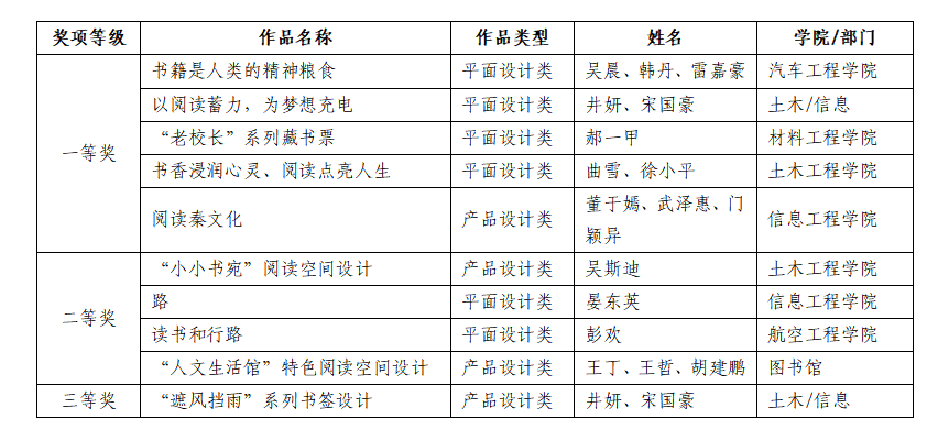 在今年“书香校园”读书文化节中启动了我校的阅读文化创意设计征集活动,图书馆、信息工程学院、土木工程学院、航空工程学院、材料工程学院等部门高度重视,组织师生积极参与,悉心指导参赛作品,在陕西省赛中荣获一等奖5项、二等奖4项、三等奖1项,我校获优秀组织奖。