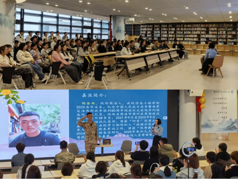 9月28日下午,第11期工圕图书馆活动在经开校区图文信息中心三楼工大记忆研习空间如期与读者见面。“9.3”阅兵仪式受阅序列预备役方队成员,我校信息工程学院2025届毕业生刘全兴作为“真人图书”,以“96米的征程与荣光”为主题进行了分享,现场近100名师生共同聆听那段镌刻着荣耀与坚守的热血故事,1000余名校内外读者通过线上参与了活动。
