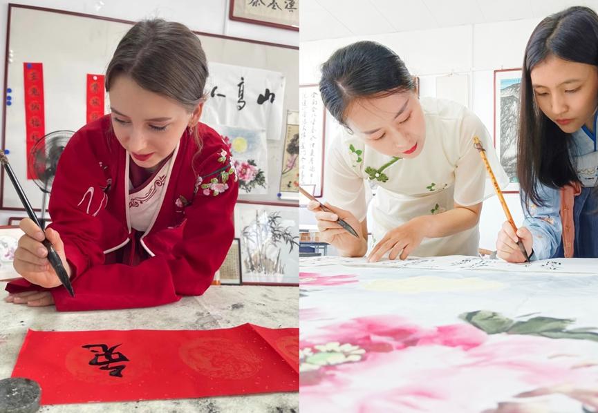 活动的第一部分由高建科老师简单讲述了传统书法知识。首先高老师对书法用到的文房四宝“笔、墨、纸、砚”进行逐一讲解,指导留学生正确的执笔方法、书写姿势和书写章法,使留学生对中国书法有了初步的认知。同时,还展示了隶书、行书、楷书不同字体的书法作品。其次,书画老师们耐心地为留学生们示范握笔方式,细心讲解毛笔书写技巧。在老师的专业指导下,留学生们尝试提笔书写简单的毛笔字,并很快掌握要领,逐渐能够连贯地写出汉字。来自俄罗斯的留学生萨沙拿起蘸满墨汁的毛笔,一笔一画尝试书写春联。活动的第二部分由王新团老师和刘芳老师简单介绍了中国画的独特之处,并让留学生欣赏了优秀的中国画作品。中国画是具有悠久历史和优良传统的中国民族传统绘画,创作过程是运用毛笔蘸水、墨、彩作画于纸上。来自印尼的留学生唐美在王新团老师的指导下,尝试用毛笔画牡丹写意画。在书写和绘画的过程中,留学生们不仅亲身体验了中国传统的书法与绘画文化,也增加了对中国文化的了解。