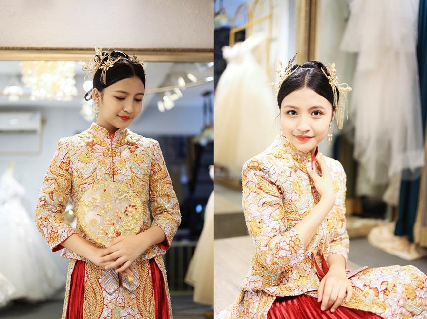 秀禾服的颜色。红色秀禾服给人一种喜庆热烈的感觉,代表红红火火的寓意,不仅用来衬托喜庆的气氛,也代表未来的日子红红火火。金色秀禾服有种贵气高雅气场,金色秀禾服与现代元素无缝结合在一起,东方古韵十足,尽展女性的端庄典雅之美。蓝色秀禾服给人一种清新的感觉,有种奢雅而自然的气息,还能呈现出柔和的视觉效果,非常别致典雅。