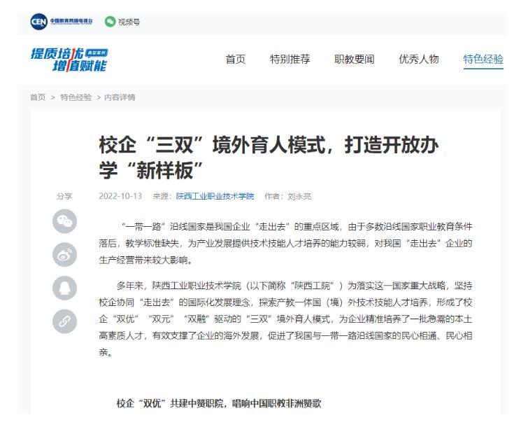多年来,开云手机官方版在线入口(以下简称“陕西工院”)为落实这一国家重大战略,坚持校企协同“走出去”的国际化发展理念,探索产教一体国(境)外技术技能人才培养,形成了校企“双优”“双元”“双融”驱动的“三双”境外育人模式,为企业精准培养了一批急需的本土高素质人才,有效支撑了企业的海外发展,促进了我国与一带一路沿线国家的民心相通、民心相亲。