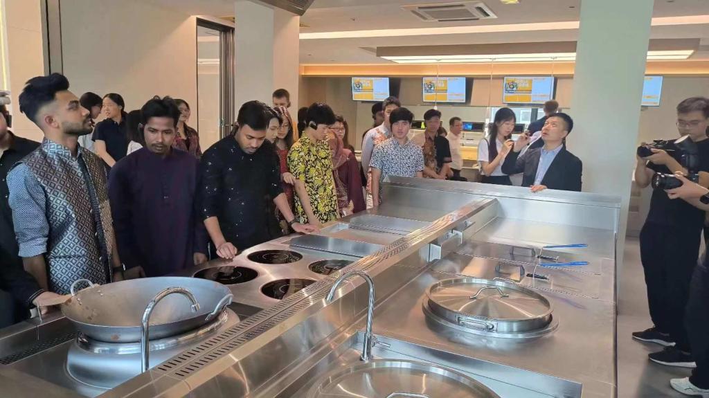 活动包括实地参观和座谈交流两部分。留学生代表走进服装公司,聆听工作人员讲解,参观了智能车间和工厂店,了解企业文化和制衣流程,感受了现代服装生产企业的科技含量和数字化程度。在华泰厨房设备有限公司,留学生代表参观了家用和商用厨房展示区,体验了智能餐台,品尝了煮面机器人制作的美食。在咸阳高新区数字会客厅,留学生深入体验了数字宠物、数字人等,全面了解咸阳高新区数字经济发展。在随后开展的主题座谈交流中,大家围绕“科技创新”和“咸阳印象”等话题,畅所欲言,气氛热烈而愉快。