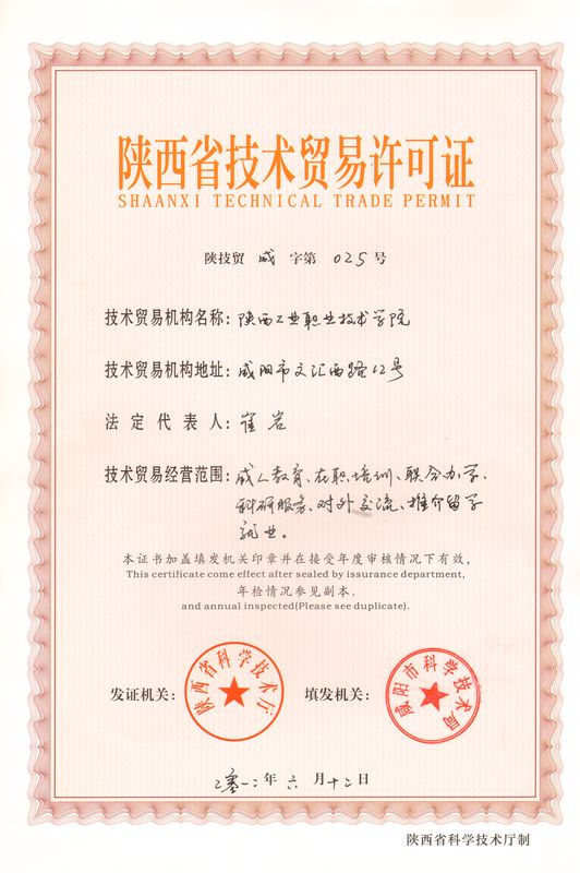 近日,经陕西省科学技术厅和咸阳市科学技术局批准,我院取得了“陕西省技术贸易许可证”。