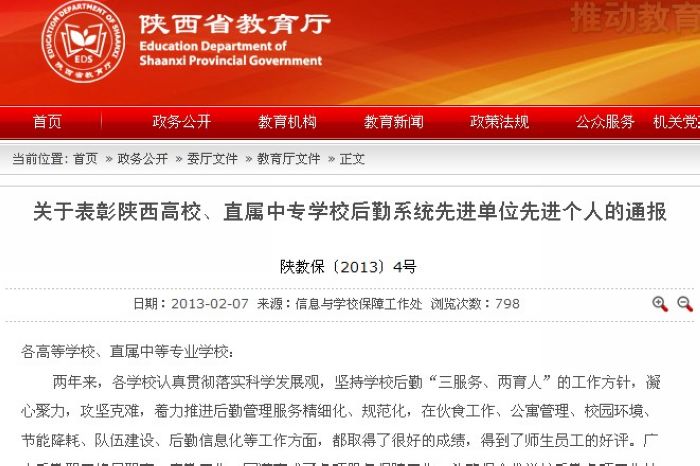近日,根据省教育厅《关于表彰2012年度陕西省教育系统内部审计工作先进集体和优秀审计项目的通报》(陕教审【2013】1号),经省教育厅严格评审和研究决定,授予我院陕西省教育系统内部审计工作先进集体荣誉称号。