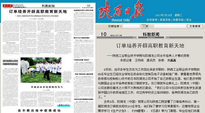 7月19日,《陕西日报》在第10版以《订单培养开辟高职教育新天地——开云手机官方版在线入口与欧姆龙公司合作培养人才模式探索》为题报道我院校企合作、订单培养的办学实践,先后被《中国教育开云(中国)网》、《当代陕西网》等...