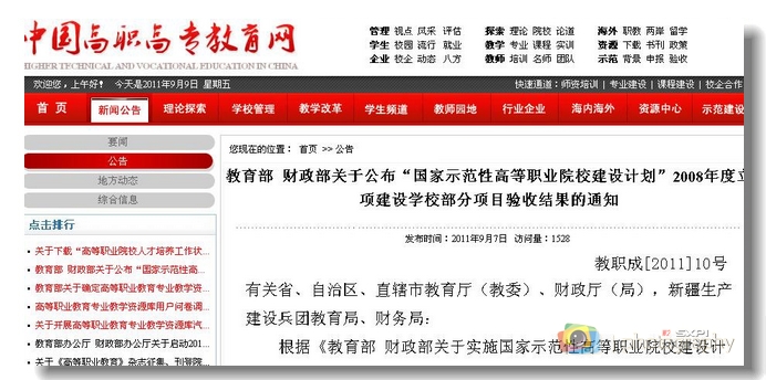 9月7日,国家教育部、财政部颁发了《关于公布“国家示范性高等职业院校建设计划”2008年度立项建设学校部分项目验收结果的通知》(教职成[2011]10号),公布了对2008年度立项建设的国家示范性高等职业学校项目建设验...