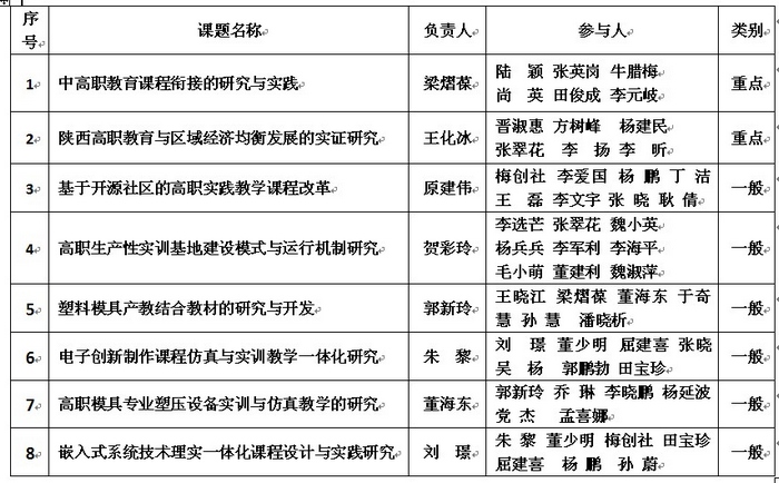 根据中国机械工业教育协会“关于公布机械行业2011年度职业教育研究立项课题的通知”(中机教协〔2011〕第24号文件),我院申报的8项课题全部获得立项。