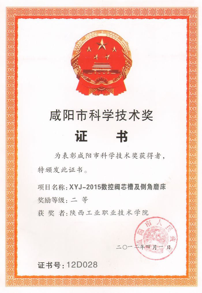 近日,接咸阳市科学技术局《关于颁发二0一一年度咸阳市科学技术奖获奖项目的通知》(咸政科【2012】30号),我院申报的“XYJ-2015数控阀芯槽及倒角磨床”项目,经专业评审组评审、评审委员会综合审核,最终获得“咸阳...