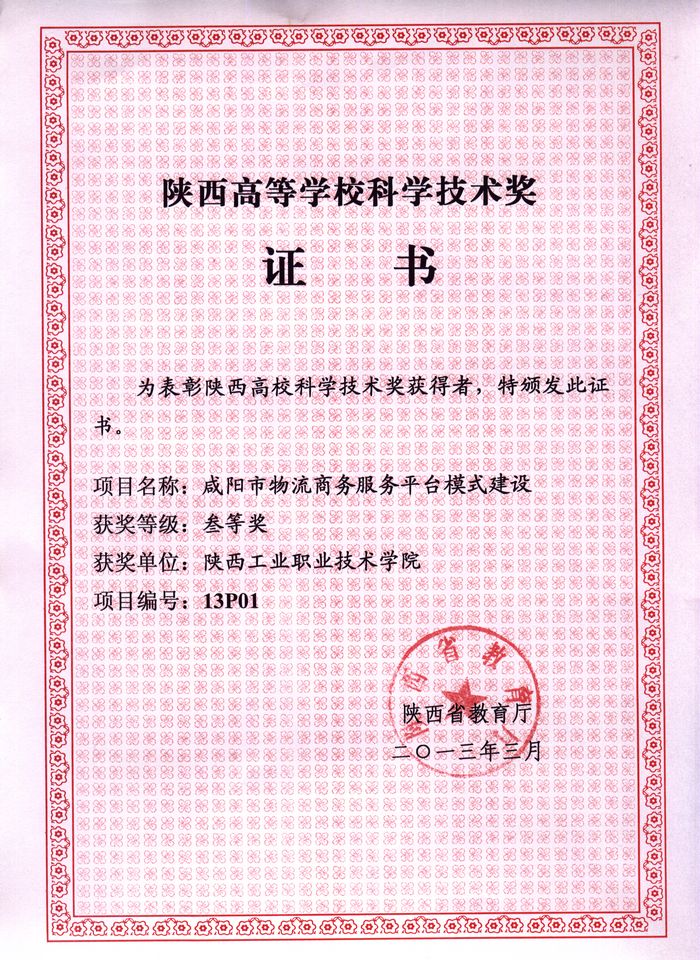 近日,根据陕西省教育厅《关于公布2013年度陕西高等学校科学技术奖获奖项目的通知》(陕教技【2013】6号)文件精神,由学院科研处组织申报、李选芒教授主持完成的“咸阳市物流商务服务平台模式建设”科研项目,经过专...